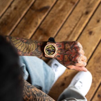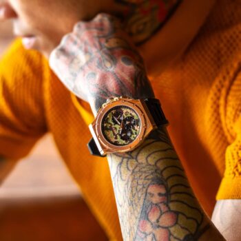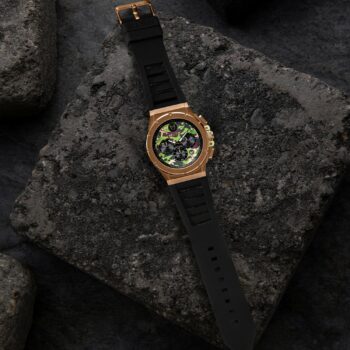 Als onderdeel van onze nieuwe MKV collectie hebben we dit rosé gouden camo horloge gemaakt! De meerkleurige camo wijzerplaat, rosé gouden kast, groen kastinzetstuk en zwarte rubberen band is de nieuwste stijl in de MKV collectie. In de rosé gouden kast heeft de wijzerplaat een aangepaste camo wijzerplaat, glanzend zwarte uur- en minutenwijzers en zwarte subdials wijzers met gouden accenten rond de uurmarkeringen. Het horloge wordt ook geleverd met een stevige zwarte rubberen band met ademende kieuwen. Dit zorgt voor luchtstroming en circulatie, zodat het bandje beter ademt om de pols. Dit horloge en zijn zilveren tegenhanger zijn uniek in hun soort en slechts beperkt verkrijgbaar.