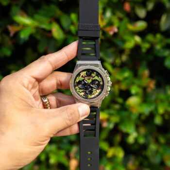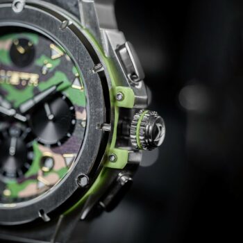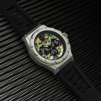 Als onderdeel van onze nieuwe MKV collectie hebben we dit zilveren camo horloge gemaakt! De meerkleurige camo wijzerplaat, zilverkleurige kast, groen kastinzetstuk en zwarte rubberen band is de nieuwste stijl in de MKV collectie. In de zilveren kast heeft de wijzerplaat een aangepaste camo wijzerplaat, glanzend zwarte uur- en minutenwijzers en zwarte subdials wijzers met gouden accenten rond de uurmarkeringen. Het horloge wordt ook geleverd met een stevige zwarte rubberen band met ademende kieuwen. Dit zorgt voor luchtstroming en circulatie, zodat het bandje beter ademt om de pols. Dit horloge en zijn rosé gouden tegenhanger zijn uniek in hun soort en slechts beperkt verkrijgbaar.