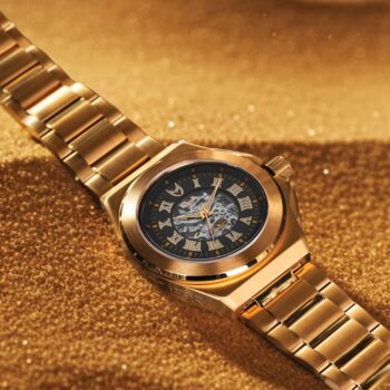 Het Noble Skeleton Automatic heren horloge in Goud heeft een unieke doorzichtige wijzerplaat met Romeinse cijfers. Dit horloge heeft een ‘Skeleton’ automatisch uurwerk van Miyota met een gangreserve van 42 uur en is zowel handmatig als automatisch op te winden. Het glas aan de voor en achterkant is van krasbestendig saffierglas. De roestvrijstalen band is volledig op maat af te stellen en heeft een vlindersluiting. Het horloge heeft een matte afwerking op de kast en de band. De Noble is een stijlvol mannen horloge met een diameter van 43mm en een dikte van 11mm. De Noble is ook waterdicht tot 100 meter dus zwemmen met het horloge is geen enkel probleem. Met een uitgebreide garantie van 2 jaar ben je ook verzekerd van een kwalitatief horloge waar je lang van zult genieten.